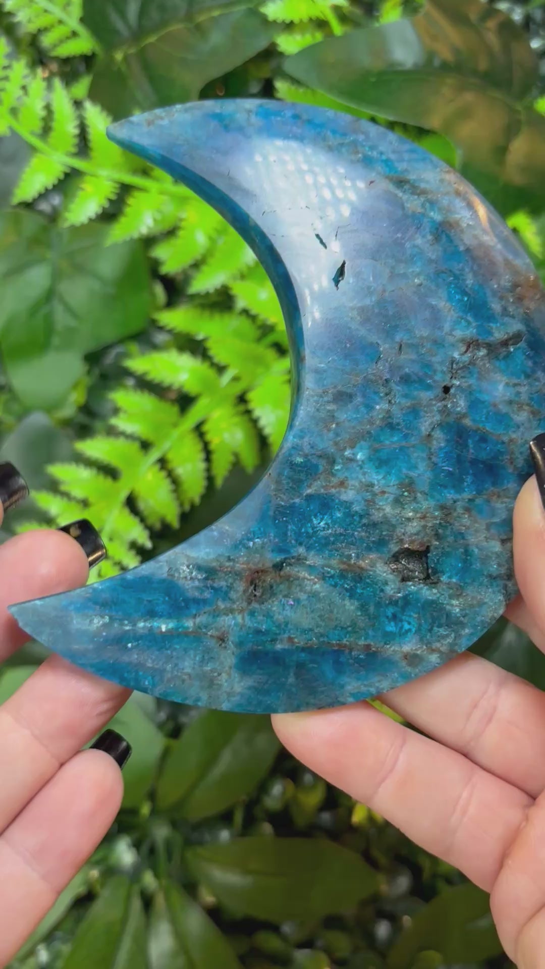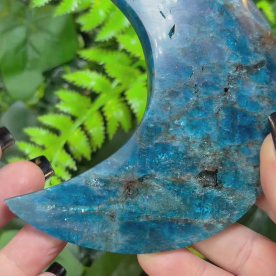 Vivid blue Apatite moon on a custom made black metal stand.