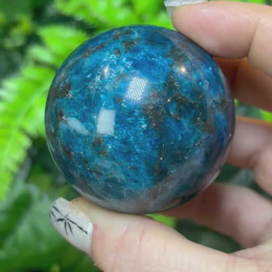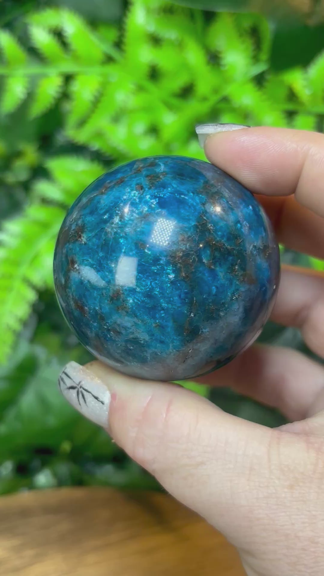 Gorgeous deep blue Apatite sphere with silver flash that dances across the surface.