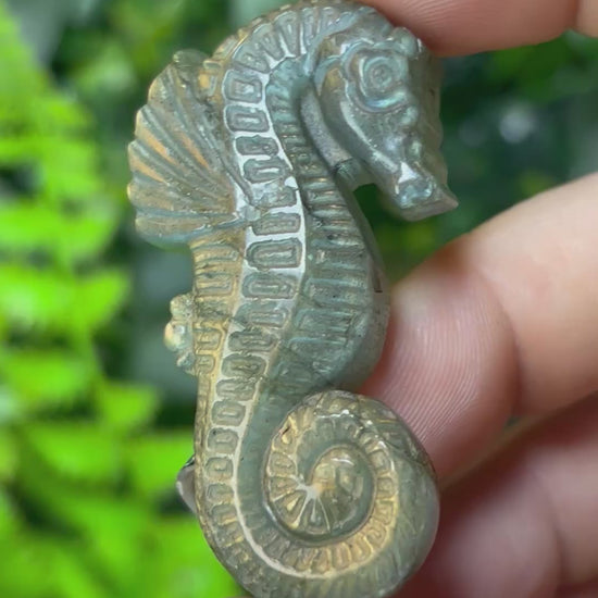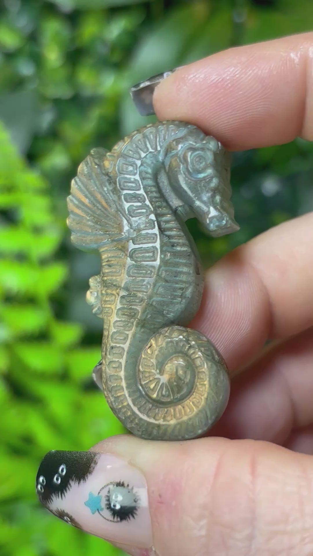 Incredibly detailed Labradorite seahorse carving with dual flash. Orange to silver.
