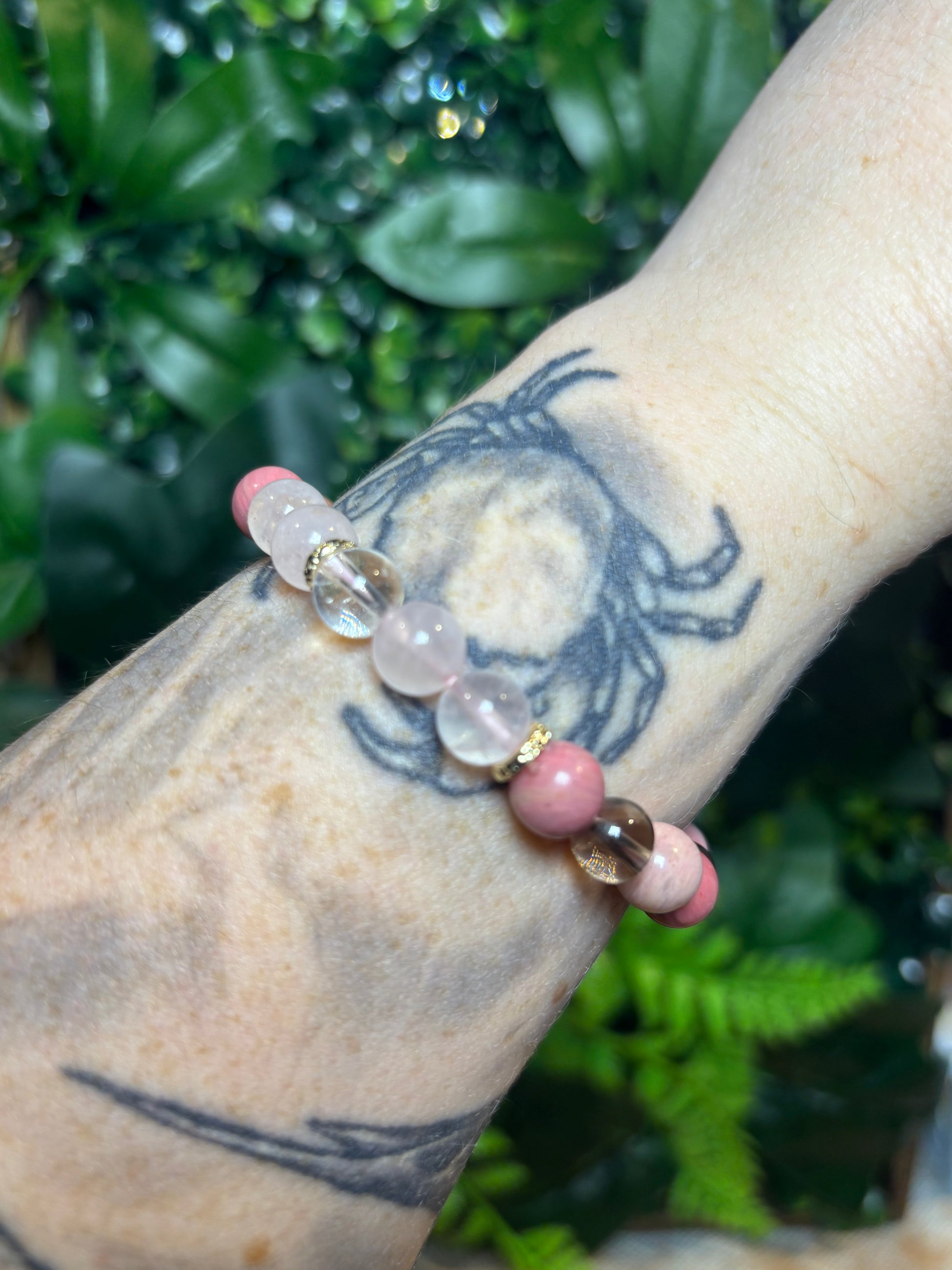 A super pretty, very feminine handmade beaded bracelet with Pink Petrified Wood, Smokey Quartz, Rose Quartz and Clear Quartz.