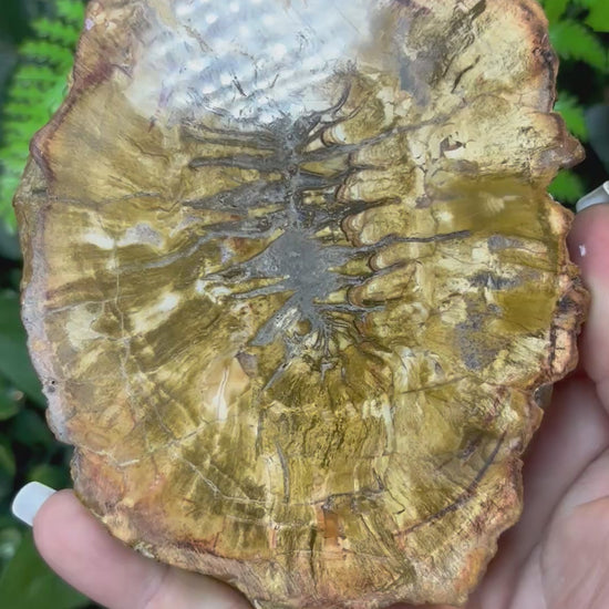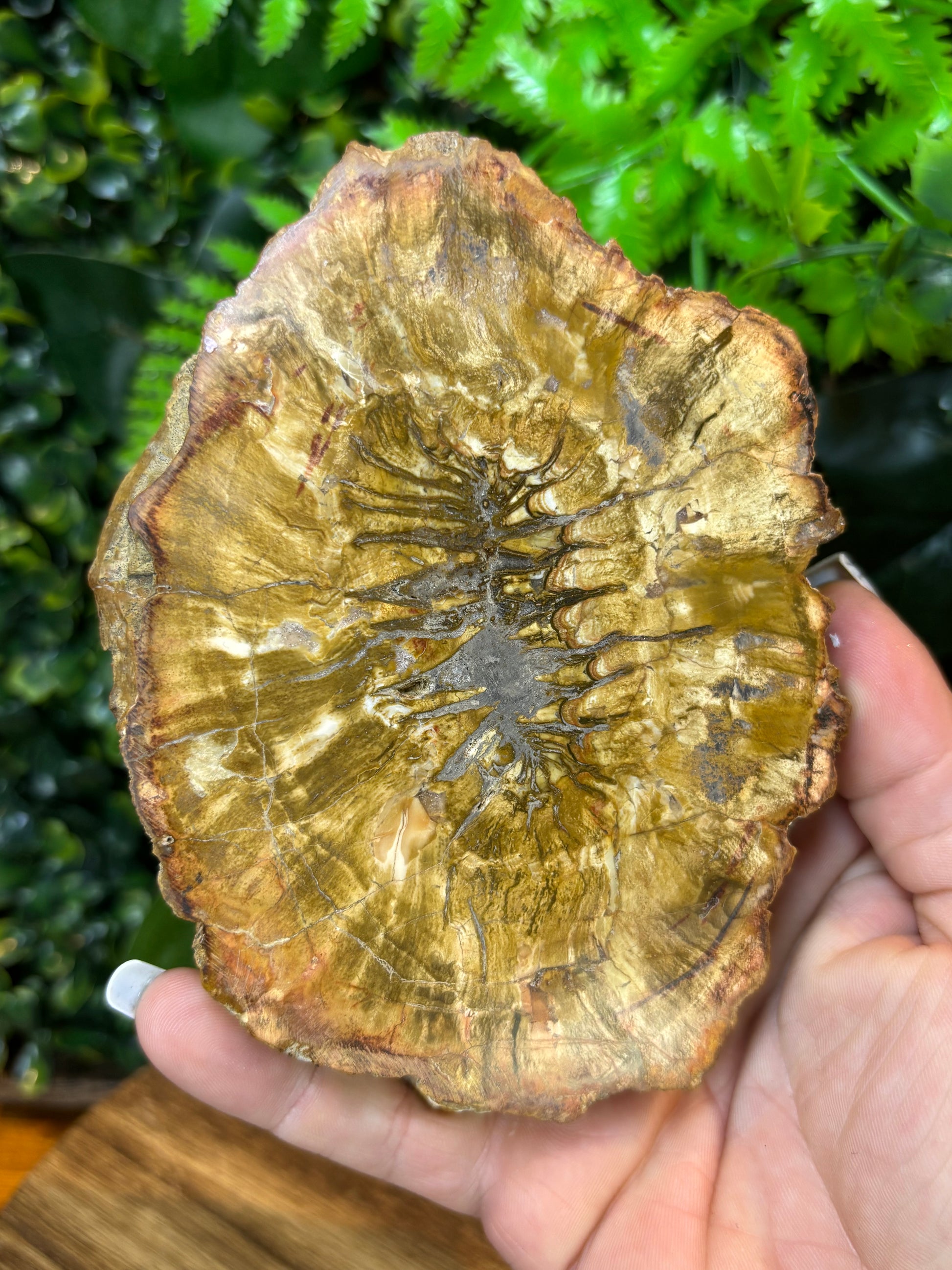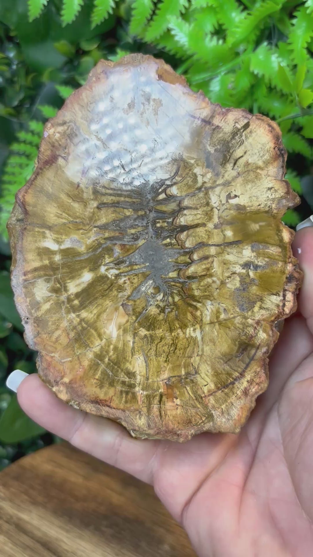 Beautiful petrified wood slab. How incredible to hold a piece if Earth’s history in your hand! . Beautifully polished with natural edges with visible bark. Size 12cm.